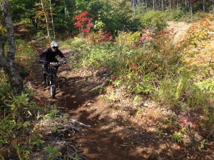 そして続くリエゾンは下り基調。乗鞍バイクパーク(イガヤスキー場内)に戻り、バンクの続くコースを攻めます。途中に登りも含めた樹林セクションがあり、いつまで続くかと思わせる連続バンク(しかも滑りやすい!)があり、ゴールをめざします。